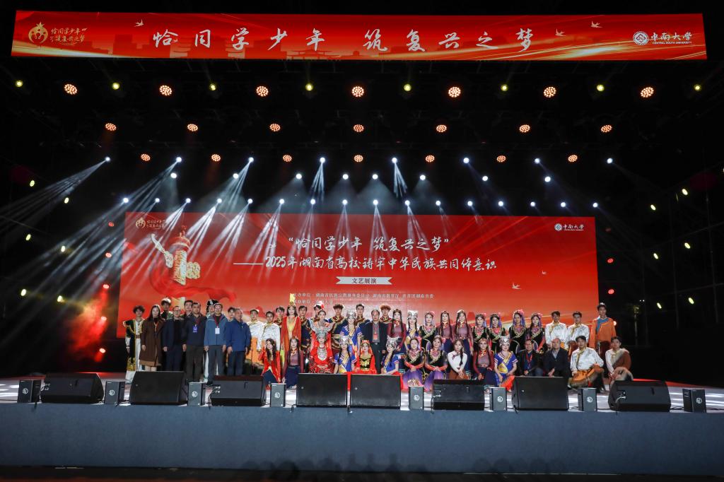 11月5日,“恰同学少年 筑复兴之梦”——2025年湖南省高校铸牢中华民族共同体意识现场展示体验暨文艺展演在中南大学盛大开幕。我校选送的民族舞蹈《爱我中华》在展演中精彩亮相,以热情洋溢的表演赢得现场观众阵阵掌声,生动展现了各族学子团结一心、奋发向上的精神风貌。党委副书记何建雄带领党委统战部、学生工作部、少数民族预科教育部等部门负责人亲临现场观摩指导。