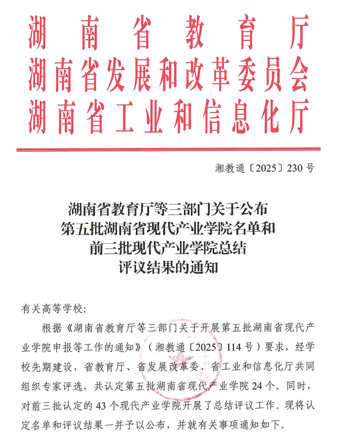 近日,湖南省教育厅、省发展和改革委员会、省工业和信息化厅联合发布通知,公布第五批湖南省现代产业学院名单及相关评议结果。由我校电气与信息工程学院牵头申报的“电力计量现代产业学院”成功入选。该项目的获批,标志着我校在深化产教融合、推动应用型人才培养改革方面取得的又一重要成果,为服务湖南“4×4”现代化产业体系建设注入新动力。