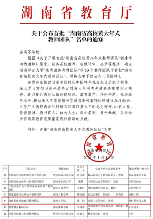 近日,湖南省教育厅公布首批“湖南省高校黄大年式教师团队”评选结果,我校曾广胜教授领衔的“绿色低碳功能建材教师团队”成功入选。全省共50个团队获此荣誉,此次入选标志着我校在教师队伍建设与学科发展上取得重要突破。
