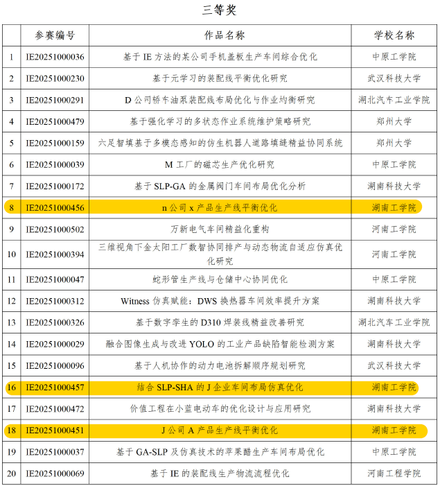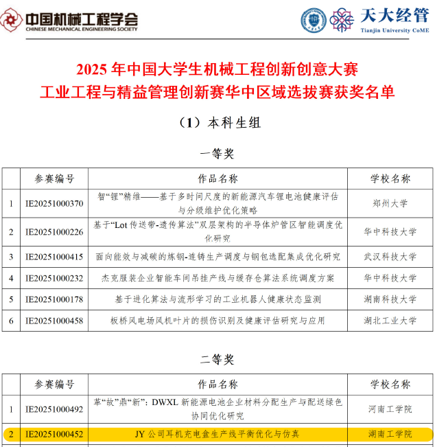 9月22日-23日,2025年中国大学生机械工程创新创意大赛工业工程与精益管理创新赛华中区域赛(以下简称华中区域赛)通过线上答辩的形式完成,该区域赛由湖中科技大学主办,河南、湖北、湖南和江西等四个省的多所高校选派队伍参加本次区域赛。以我院工业工程专业学生为主组队并通过校内选拔赛的5支参赛队经过激烈的角逐,凭借出色的表现,一举斩获华中区域赛(本科生组)二等奖1项,三等奖3项,其中获得二等奖的队伍还有机会参加该项赛事的全国赛。