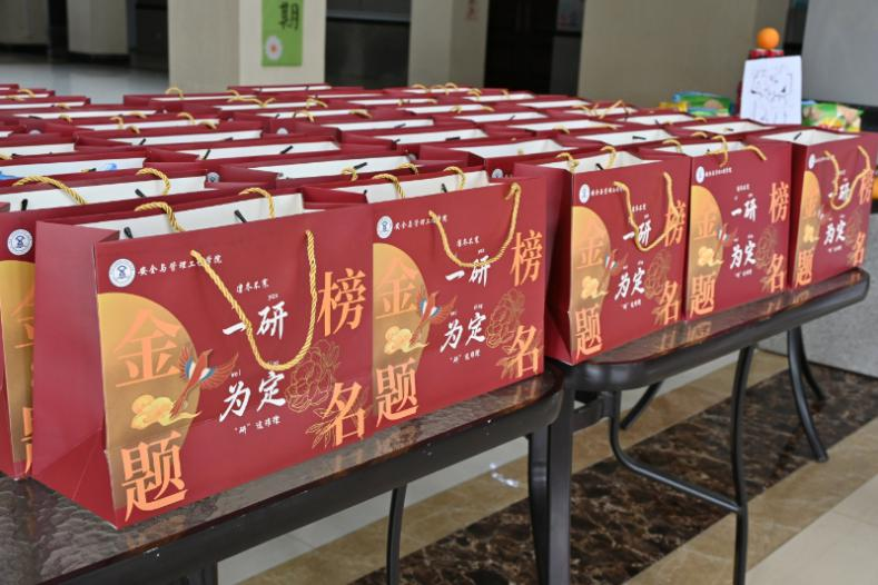 随后,学院领导与老师们共同为考研学子分发了精心准备的“考研助力包”。助力包装载着学院的深情厚谊与美好祝愿,其中包含:寓意“心想事成”的橙子、象征“欢乐顺遂”的乐事薯条、代表“牛气冲天”的旺仔牛奶、实用温暖的暖宝宝、印有祝福语的纸巾以及齐全的考试工具。每一份礼物都寄托着学院对学子们的细致关怀,期盼他们在考场上从容应对,发挥出色。