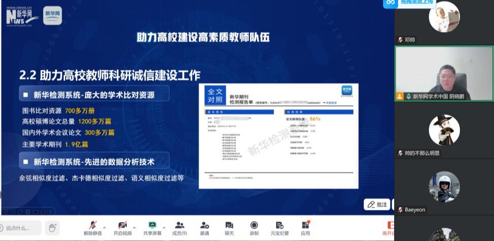阴晓鹏围绕讲座主题,结合教育强国建设相关要求,简要介绍了新华网学术中国平台的国家级定位,重点讲解了平台在教师科研诚信建设、学术成果收录传播、专利价值评估及成果转化等方面的核心举措,为高校学术发展提供全方位支撑,助力高校实现高质量发展。