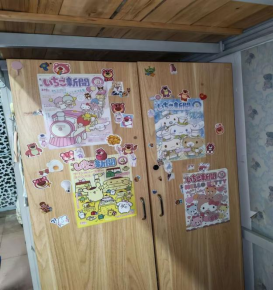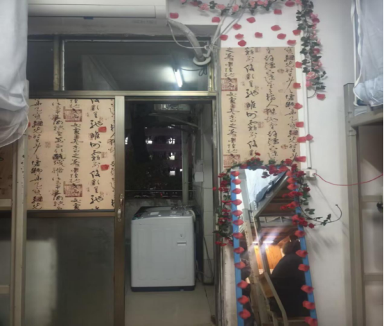 在此次设计大赛中部分寝室中融入了传统国风元素,以毛笔书法卷轴搭配浪漫挂饰挂饰装饰门窗,让雅致的文化气息与生活空间相融合,既打破了常规寝室的单调感,也传递出对传统文化的喜爱与审美,营造出独特的文化氛围。