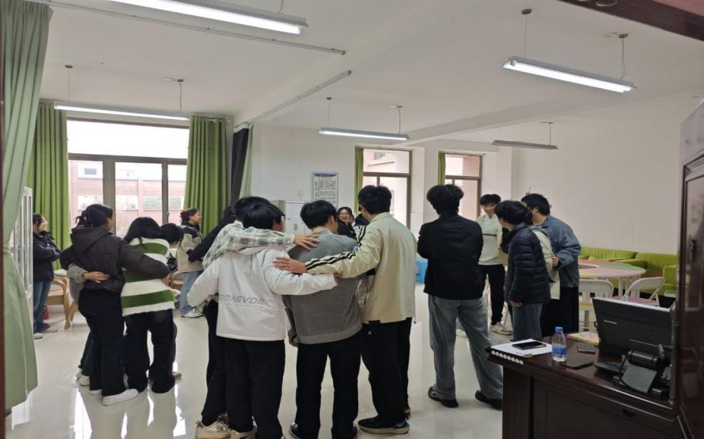 活动以“抱团取暖”游戏破冰,大家围成一圈,跟着音乐的节奏顺时针转动,音乐停,主持人喊出抱团数量,同学们或从容依偎,或抓耳挠腮、孤身无措地站着,愉快的氛围融化了彼此间陌生感。