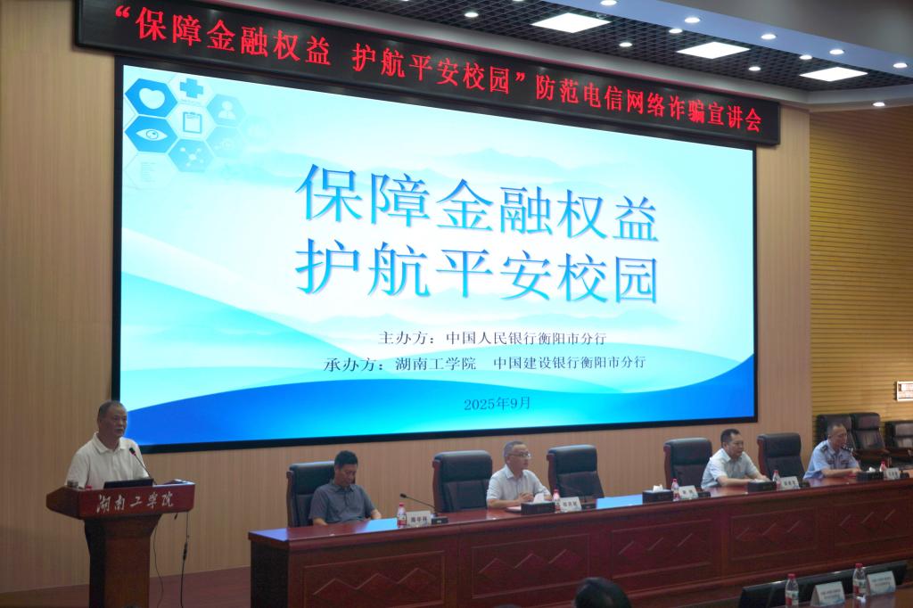 宣讲会由湖南工学院党委委员、副校长谢柯主持。中国人民银行衡阳市分行党委委员、副行长郑洪斌作动员讲话。衡阳市“131”机制办从守住“心防”,不贪不信;保护“个人信息”,不透不借;安装“反诈利器”,不嫌不卸;牢记“求助渠道”,不急不慌等方面提出建议。中国人民银行衡阳市分行以不出租、出借和卖买银行卡为主题,分别从案例警示、金融惩戒、反诈提醒告诫大家。中国建设银行衡阳市分行分别从电信网络诈骗、高频诈骗类型、实战防护指南、互动与总结,分享了反诈要点。通过通俗易懂的宣讲,推动诈骗风险提示深入学校、直达师生,让诈骗违法犯罪活动在校园无处藏身。