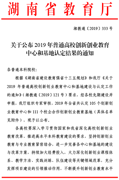 喜讯!我院喜获湖南省2019年普通高校创新创业教育中心认定