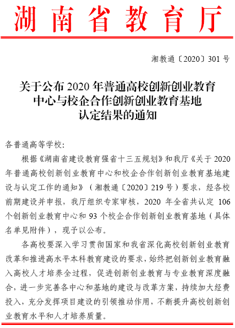 根据《湖南省建设教育强省十三五规划》和《关于2020年普通高校创新创业教育中心和基地建设与认定工作的通知》(湘教通〔2020〕219号)文件的相关要求,学院积极组织撰写申报材料,经教育厅材料初审、组织专家审核等环节,最终包括我院在内的93家单位获得2020年度普通高校校企合作创新创业教育基地称号。