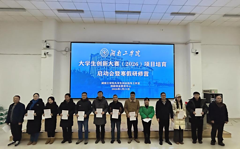 为扎实推进我校中国国际大学生创新大赛(2026)备赛工作,强化项目源头培育与团队实战能力,1月21日至22日,湖南工学院大学生创新大赛(2026)项目培育启动会暨寒假研修营在双创楼103路演厅成功举行。