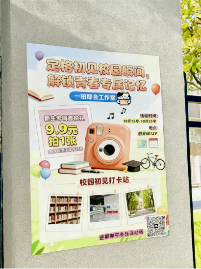 2025年10月15日至25日,我校创业园129“一拍即合”工作室成功举办“定格初见校园瞬间,解锁青春专属记忆”主题拍立得活动。作为大学生创业园创业项目推广季系列活动之一,“一拍即合”以优质、亲民的影像服务,为2025级新生留下了珍贵的校园初印象。