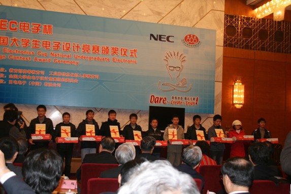 2009年12月5号“2009年第九届全国大学生电子设计竞赛”颁奖典礼在人民大会堂隆重举行。原全国政协副主席胡启立,教育部高教司副司长刘桔,工业和信息化部人教司司长陈小祝,全国大学生电子设计竞赛组委会主任、中国科学院、中国工程院王越院士等参加颁奖典礼。我校电气与信息工程系学生郭扬、张桐、全超武三位同学获全国竞赛一等奖并应邀参加了颁奖大会,为学校争得了荣誉。