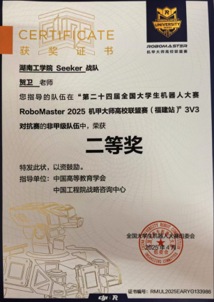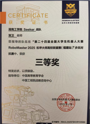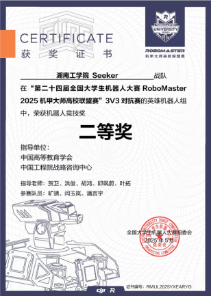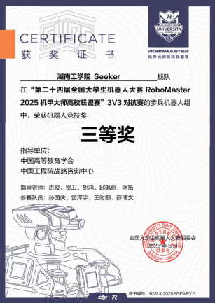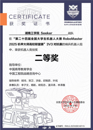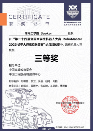 Seeker战队成立于2024年,首次参赛中便崭露头角,荣获2024赛季步兵对抗赛国家一等奖。2025年我校Seeker战队荣获3V3对抗赛二等奖,步兵对抗赛三等奖;并凭借卓越的机器人性能在机器人竞技奖中荣获二等奖两项,三等奖两项。(比赛链接视频:https://b23.tv/52EQ0qm)