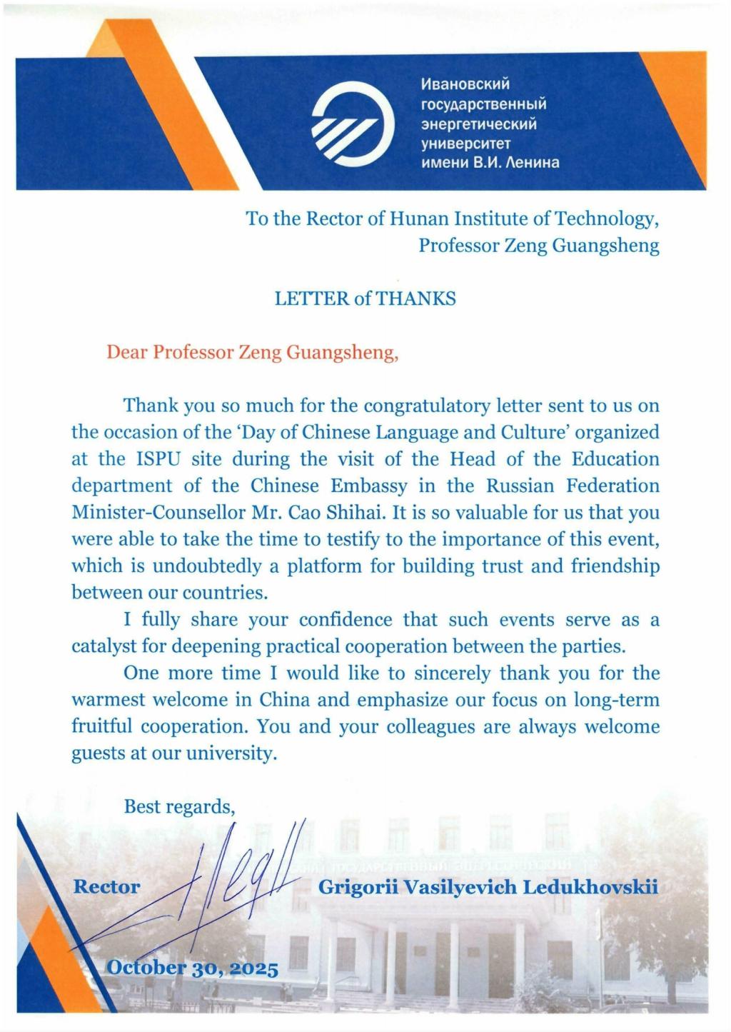 俄罗斯伊万诺沃国立动力大学10月28日在学校举办了“中文语言文化日”活动,中国驻俄罗斯联邦大使馆教育处负责人曹士海公使衔参赞一行到访该校并参加活动,我校曾广胜校长代表学校发去贺信。活动结束后,伊万诺沃国立动力大学列杜霍夫斯基校长发来感谢信,信中表达了对曾校长和我校感激之情,并重申了推动双方长期富有成效合作的坚定意愿,同时也表示我校贺信充分彰显了此次活动作为构建两国信任与友谊桥梁的重要意义。(文/王丹 图/陆秀令 审稿人/一审:邹莉 二审:彭艳 三审:陆秀令)