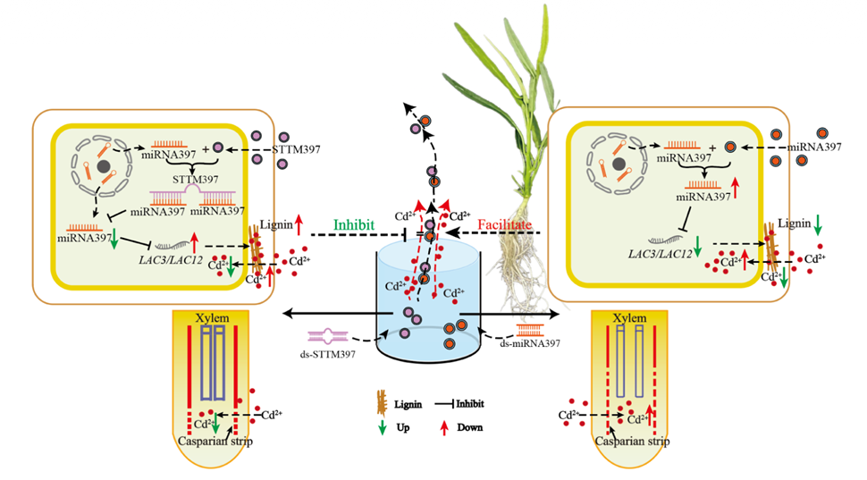 研究团队通过水培方式向蕹菜营养液中添加20 μM的合成双链RNA(包括miRNA397及其短串联靶标模拟物STTM397)。利用Cy3荧光标记示踪技术,证实外源dsRNA可被根系表皮细胞高效吸收,并经木质部运输至地上部。结合电镜观察、基因表达分析、木质素定量及镉荧光定位等方法,系统评估了外源dsRNA对植株生长、镉积累与氧化应激的调控效应。结果表明,外源miRNA397通过抑制LAC3/LAC12表达削弱木质化作用,增强镉的迁移性;而外源STTM397则通过提升根细胞壁屏障与凯氏带完整性,将镉有效固持于根表,降低其向芽部的积累。外源dsRNA在植株内具备一定的瞬时稳定性,并可精准调控miRNA397-漆酶分子模块,体现出良好的生物安全性与作用有效性(图1)。