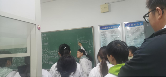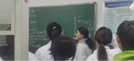 本次课程王霞老师打破传统实验课“教师讲、学生做”的模式,以“翻转课堂”为核心设计,融合学生主讲、教师精讲与互动找茬环节,让学生从“被动操作”转向“主动探究”,成为实验课堂的真正主角。早在实验课前,授课教师便将“环己烯的制备”相关资料(含反应原理、试剂性质、文献案例)发布给学生,要求学生梳理实验逻辑、写好实验板书。课堂伊始,学生代表从实验原理、实验装置、实验步骤等方面进行了讲解。讲解过程中,台下学生随时举手提问,如“为什么要先加环己醇再滴加浓硫酸?”,主讲学生结合预习时查阅的资料从容解答,教师则在旁适时补充,搭建起“学生自主讲解、师生互动答疑”的高效学习场景,为后续实验操作筑牢理论基础。在学生完成基础讲解后,教师聚焦实验核心难点,开启“引导式精讲”,通过“问题链”推动学生深度思考,逐一破解实验关键问题。例如,教师举起分馏柱,抛出核心问题“制备环己烯的实验装置为什么要选用分馏装置?”。在学生陷入沉思时,教师并未直接给出答案,而是引导大家回忆“蒸馏与分馏的本质区别”,“蒸馏适用于分离沸点相差较大的混合物,而分馏能实现沸点接近组分的分离。”随后,教师展示环己醇(沸点 161℃)与环己烯(沸点 83℃)的沸点数据:“反应中,生成的环己烯会与未反应的环己醇形成共沸物,二者沸点差距较小,若用蒸馏装置,会导致环己醇随环己烯一同蒸出,降低产率;而分馏装置可通过多次汽化——冷凝,精准分离出环己烯,提高产物纯度”。通过“提问——回忆——数据支撑——原理分析”的引导,学生不仅知其然,更知其所以然。为检验学生对装置细节的掌握,教师设置“装置找茬”环节,邀请学生上台排查黑板上装置图的问题。很快,有学生发现“温度计的水银球位置不对”,“正常应该对准蒸馏烧瓶的支管口,但这套装置的温度计插得有点深”。教师立刻追问:“如果位置错误,会对实验产生什么影响?”在学生讨论后,教师总结:“温度计水银球需与支管口平齐,才能准确测量馏出液的温度;若插得太深,测量的是反应液温度,会导致误判馏出时机,可能收集到杂质;若插得太浅,则无法准确捕捉温度变化,影响产物收集。”这一环节让学生深刻意识到“装置细节决定实验成败”后续王老师继续通过引导式教学破解了“催化剂的选择”“反应终点的判断”等问题。在完成理论讲解与问题剖析后,学生分组进行实验操作,教师则在各小组间巡回指导,针对学生遇到的问题继续采用“引导式教学”,如学生困惑“加热时为何要控制速率”,教师不直接解答,而是反问“如果加热太快,会出现什么情况?”,让学生通过观察“暴沸”“馏出液浑浊”等现象自主得出结论。