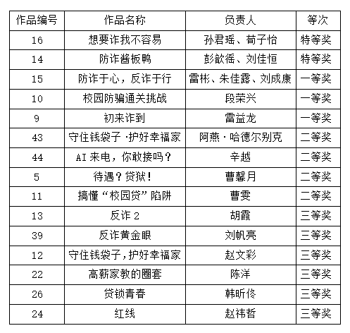 根据《关于组织举办湖南工学院“守住钱袋子·护好幸福家”防范非法金融活动短视频征集大赛的通知》的要求和安排,通过广泛发动,各二级学院(部)积极报送,共征集防范非法金融活动短视频作品44件,学校组织专家对作品进行评审,共评选出特等奖2个,一等奖3个,二等奖4个,三等奖6个,优秀组织奖3个,优秀指导老师奖5个,最佳传播奖3个。现将结果公示如下: