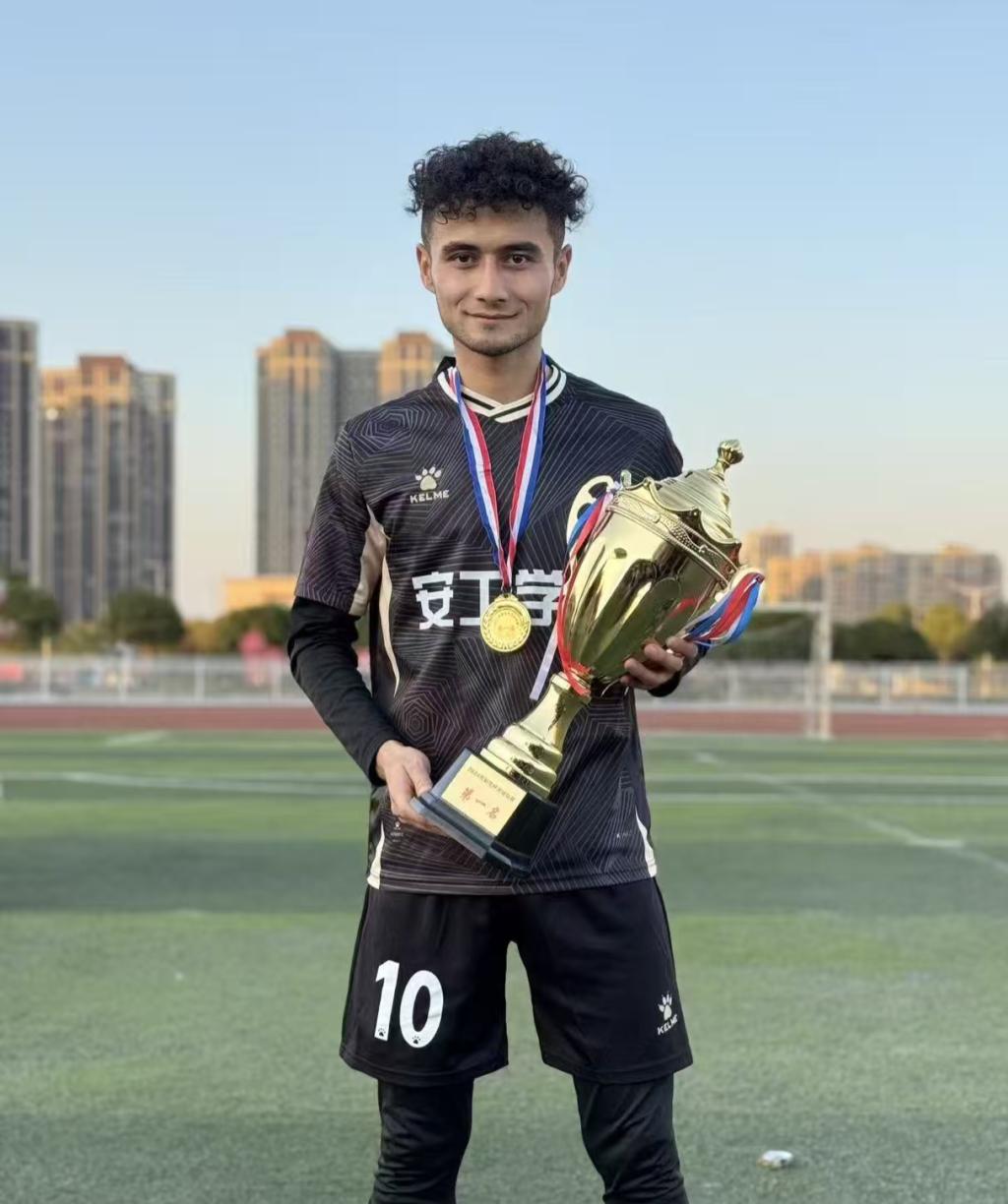 艾斯杜拉・艾尔肯 2003 年 3 月生于新疆阿图什,在足球赛场常担任前锋或前腰,此次以 15 号球员身份代表衡阳队征战湘超。他曾获新疆青少年校园足球联赛总决赛冠军、U18 新疆青少年锦标赛亚军,进入我校后,助力团队拿下衡阳市青少年校园足球大学生联赛冠军、湖南省青少年校园足球大学生联赛(校园组)冠军等荣誉,还获评市级“优秀运动员”。
