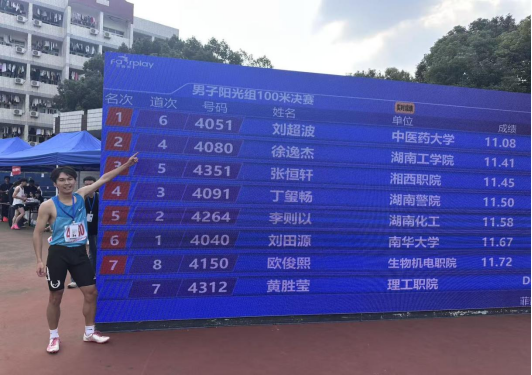 10月28日,在湖南科技大学举行的2025年湖南省大学生田径比赛阳光组男子100米决赛中,我校电气与信息工程学院电气2504班徐逸杰同学经过预赛、决赛两轮激烈角逐,最终以11.41秒的优异成绩夺得该项目亚军,并成功达到男子100米国家二级运动员标准(11.54秒)。