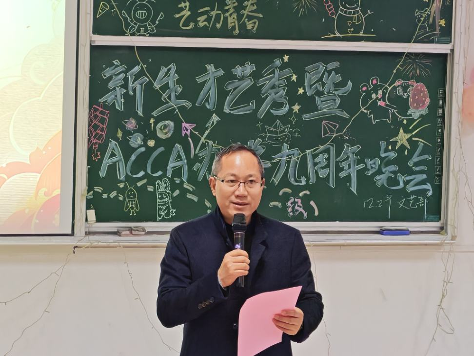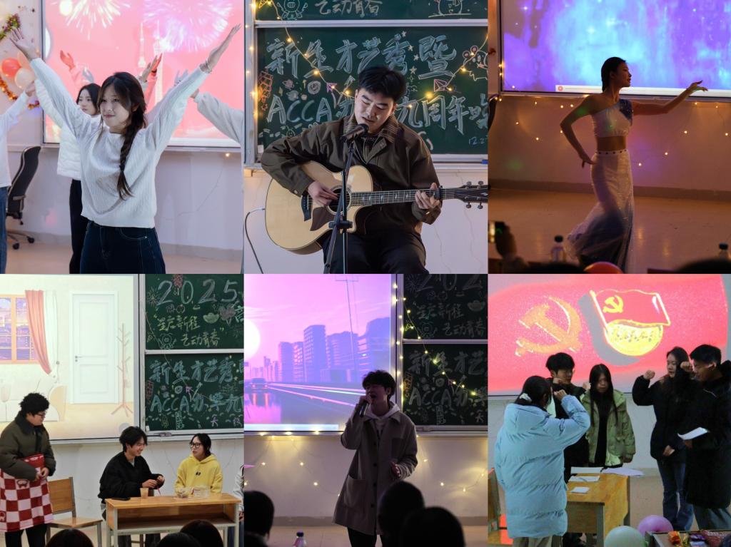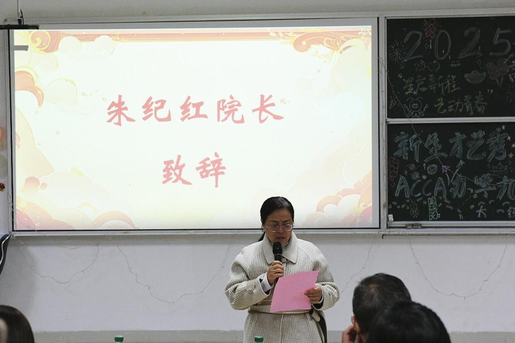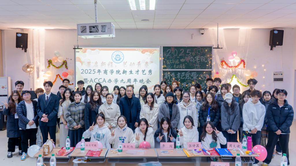 为丰富校园文化生活,展现新生青春风采,2025年12月29日晚,商学院隆重举办“星启新程,艺动青春”新生才艺秀暨ACCA办学九周年晚会。商学院副院长李闯、朱纪红,学工办主任张诗菡,学工办副主任白力可艳,以及全体辅导员参加。晚会采用线上线下同步直播的形式,吸引了众多师生实时互动。