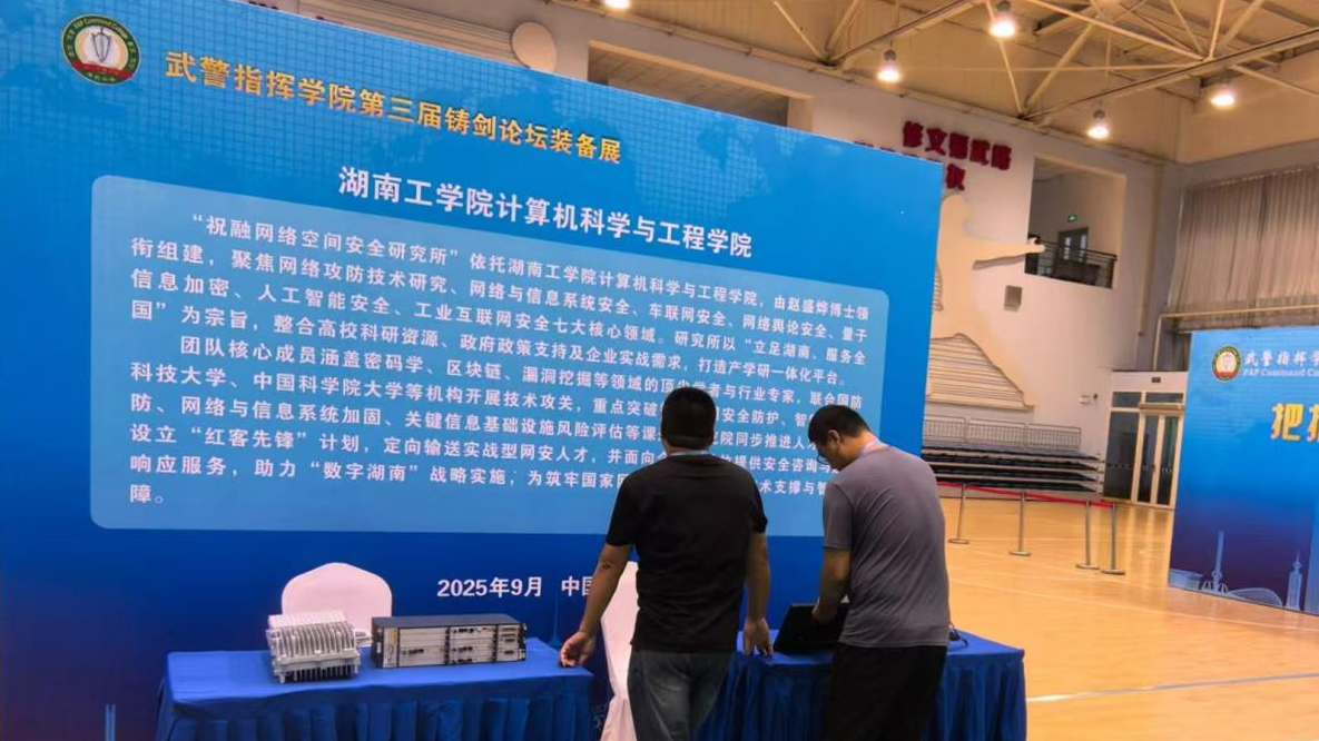 2025年9月由武警指挥学院主办的第三届“铸剑论坛”装备展在天津校区盛大开幕。本届论坛聚焦“科技赋能智慧警备,创新驱动安全未来”,吸引了众多军事科研单位、高新技术企业及顶尖学术机构参展。其中,湖南工学院计算机科学与工程学院旗下的“祝融网络空间安全研究所”携七大核心领域的前沿成果精彩亮相,成为展会焦点,其卓越的科研实力与产学研融合模式获得了莅临现场的各级领导与评审专家的一致好评。
