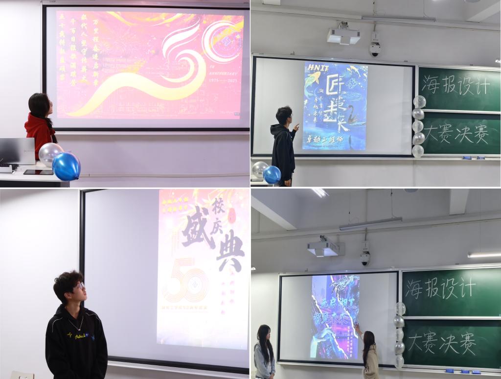 本次大赛以“五秩弦歌・工韵承新”“雁城文脉·湖工印记”“青春匠造·创享未来”“匠心筑梦・劳动创想”“元启未来·数智湖工”为创作方向,面向全院征集作品。活动启动后,同学们积极响应、踊跃参与,共收到38份参赛作品,经初审筛选,16份作品晋级决赛。决赛现场,参赛选手围绕作品理念与设计思路展开展示,以扎实功底与独特创新思维,呈现出一批兼具创意与感染力的佳作。作品或诠释校园文脉与地方底蕴,或畅想数字未来与匠心传承,用艺术设计彰显新时代青年的审美追求与责任担当。评委老师从主题契合度、视觉表现力、文化内涵等维度专业点评,既肯定亮点,也针对性提出优化方向,助力选手深化设计逻辑。