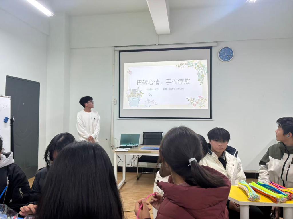 12月28日晚,计算机科学与工程学院2025年“聆听Young心声”系列第二期心理沙龙活动在信息楼2218团体辅导室顺利举办。本次活动以“扭转心情,手作疗愈”为主题,旨在为期末备考阶段的学子提供情绪舒缓与压力释放的创意途径。