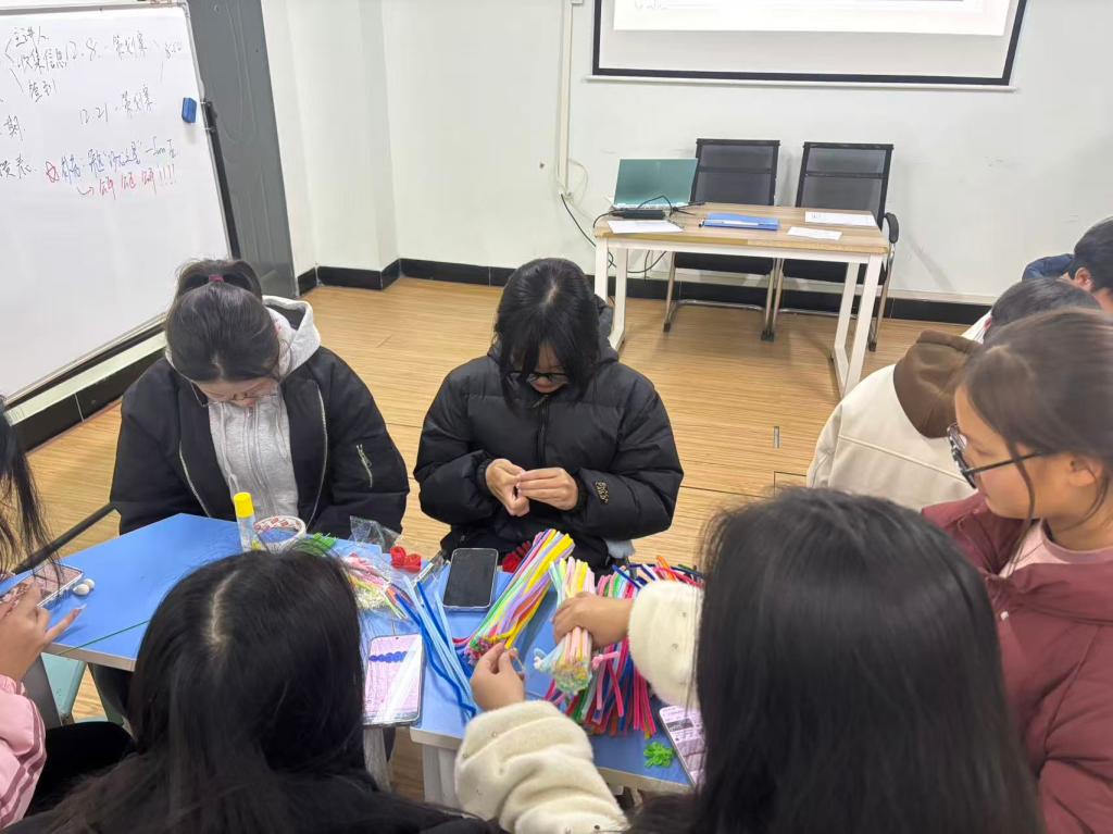活动以扭扭棒手工创作为载体,引导同学们将抽象的情绪通过双手创作进行具象化表达。活动中,同学们充分发挥想象力与创造力,巧用手中的扭扭棒材料,精心制作出许愿树、小灯笼等充满创意与情感温度的手工作品。大家在专注创作的过程中舒缓焦虑、释放压力,并在交流互动中增进了解,获得同伴的支持与鼓励。