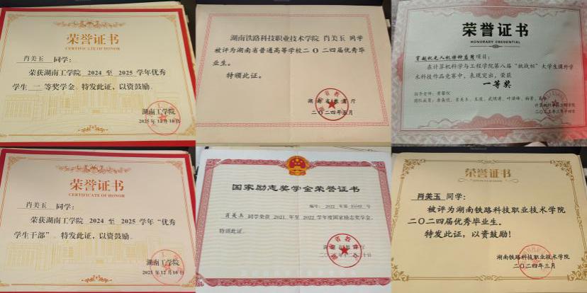 肖美玉,女,汉族,中共预备党员,为湖南工学院计算机科学与工程学院2022级计算机科学与技术专业学生,担任班级班长兼学习委员职务。在校期间多次获得校、院级荣誉。专科阶段荣获国家励志奖学金1次、校级一等奖学金1次、校级二等奖学金1次;连续2年获评校级优秀学生干部;连续2年获评校级优秀青年志愿者;获评2024年校级优秀毕业生、省级优秀毕业生。升本科后,积极参与各项活动,荣获国家励志奖学金1次、校级一等奖学金1次、校级优秀学生干部1次。