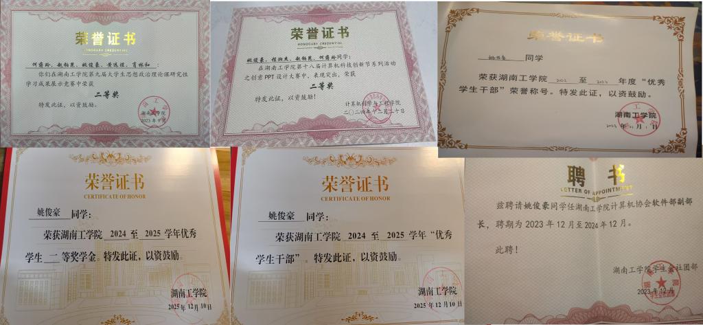 姚俊豪,男,计算机科学与工程学院2022级网络工程专业学生,现担任班级学习委员。在校期间荣获湖南工学院第九届大学生思想政治理论课研究性学习成果展示竞赛二等奖、十八届计算机科技创新节PPT设计大赛二等奖、2022-2023年度优秀学生干部、2024-2025学年优秀学生干部、2024-2025学年优秀学生一等奖学金。