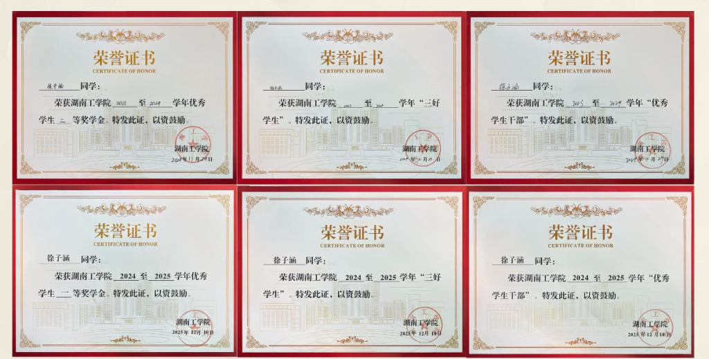 徐子涵,男,计算机科学与工程学院2023级网络工程专业学生,现任班级班长。该生在校期间思想端正、品学兼优,学习勤奋严谨,专业成绩优异,综合素质突出,连续学年斩获校级奖学金与多项荣誉称号。2023-2024学年,荣获湖南工学院优秀学生三等奖学金、二等奖学金,获评“三好学生”“优秀学生干部”;2024-2025 学年,再次荣获优秀学生二等奖学金、“三好学生”及“优秀学生干部”称号,以实际行动展现了新时代大学生良好的精神风貌与责任担当。