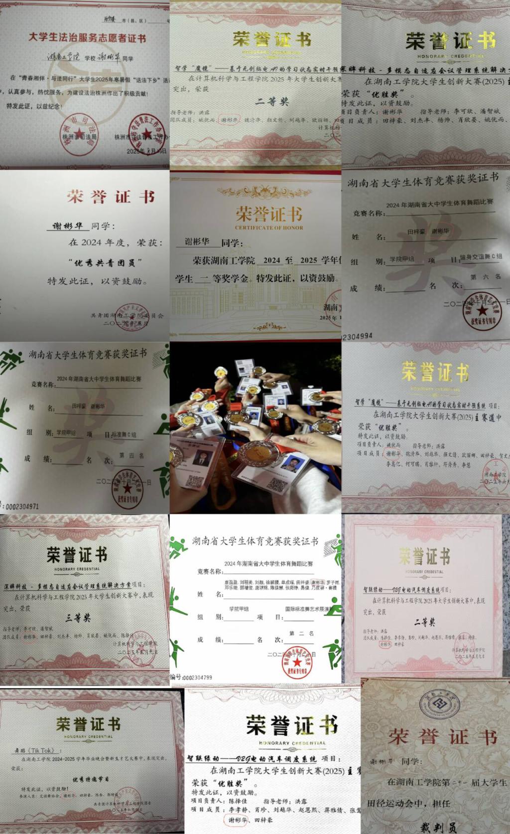 谢彬华,女,计算机科学与工程学院2023级计算机科学与技术专业学生,现任班级班长兼学习委员。2024-2025学年表现突出,获多项荣誉:思想上,2024年度荣获“优秀共青团员”称号,大一下学期推优为入党积极分子,现为中共预备党员;学业上,学业及综测成绩均列班级第一、专业第二,获校级一等奖学金;科创竞赛上,作为负责人带领团队参与多项科研项目,获大创省级立项,在“互联网+”大赛中获三项校级优胜奖及院级二、三等奖;体育竞赛上,代表学校参加省级体育舞蹈比赛,斩获多项二、三等奖;校园建设中,任校交谊舞协会多职,带领团队完成多项表演,积极参与各类志愿服务;社会实践上,2025年寒暑假参加“青春湘伴·与法同行”送法下乡活动,获株洲市司法局等颁发的法治服务志愿者证书,同时积极参与“三下乡”等社会实践活动。