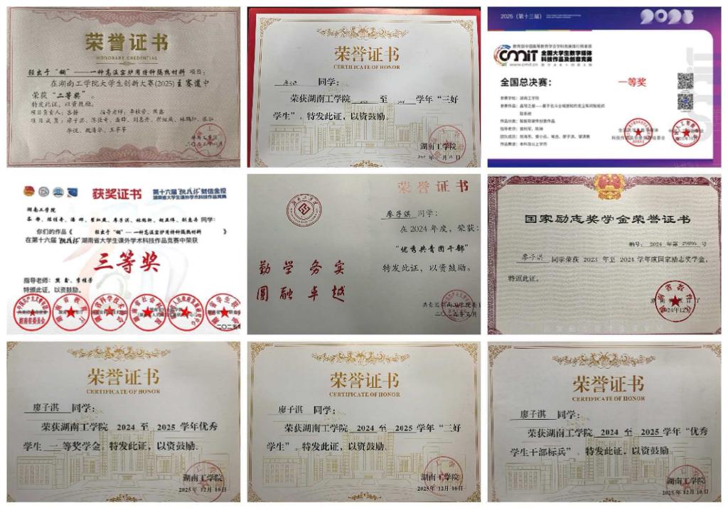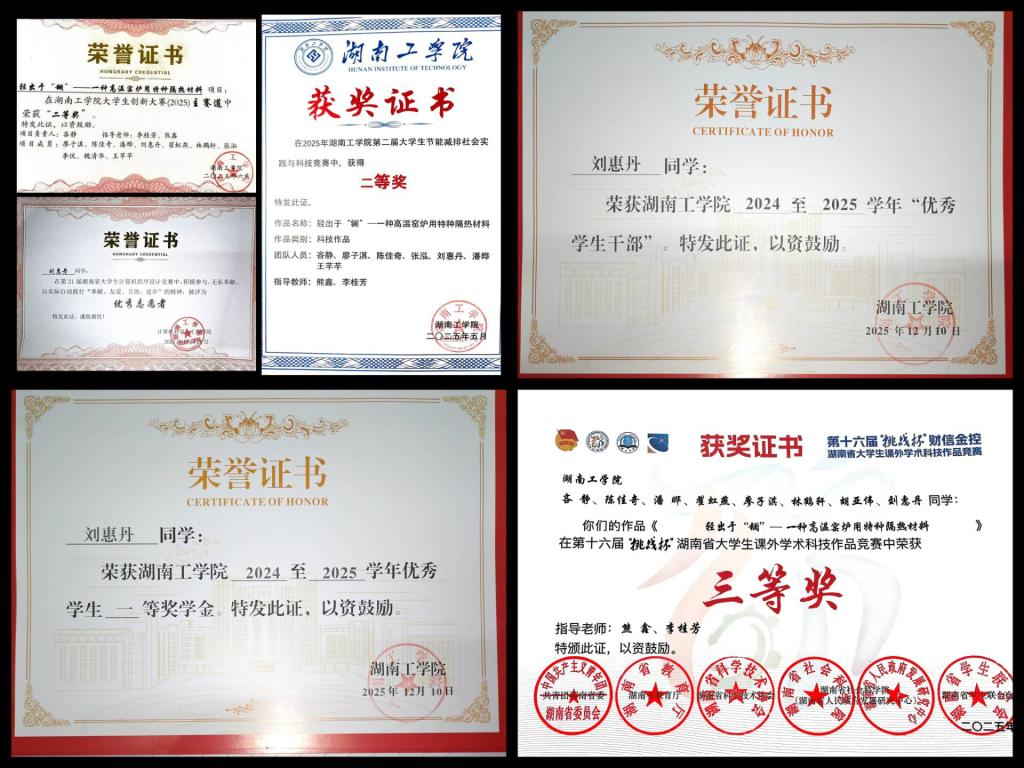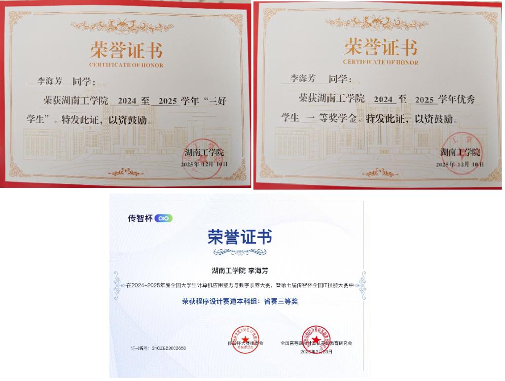 刘惠丹,女,计算机科学与工程学院2024级计算机科学与技术专业学生。该生恪守准则、笃行不怠,在思想淬炼、学业提升与实践锻炼中不断成长,综合表现突出。学习上勤奋踏实,大一学年专业排名前列,荣获国家励志奖学金、优秀学生一等奖学金、优秀学生干部、优秀志愿者等称号,积极参与各类学科竞赛,获第七届“佳智杯”全国IT技能大赛省赛三等奖、“词达人杯”英语竞赛校赛三等奖、“挑战杯”全国大学生课外学术科技作品竞赛省赛三等奖、湖南工学院第二届大学生节能减排社会实践与科技竞赛校级二等奖、中国国际大学生创新大赛校级二等奖及“布”入新局项目院级三等奖,实践创新能力突出。