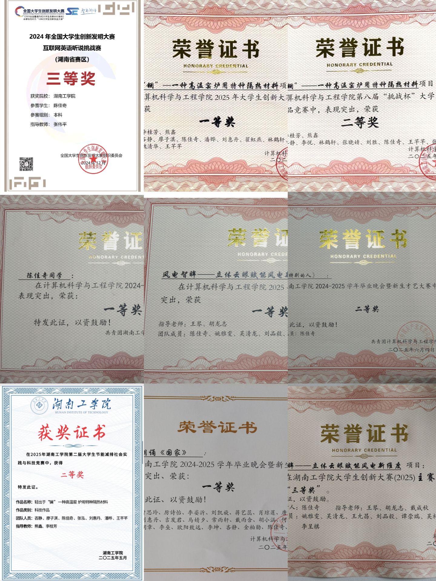 陈佳奇,女,共青团员,计算机科学与工程学院2024级网络工程专业学生。入学以来,以全面发展为目标,勤学笃行、勇于实践、乐于奉献,先后荣获第十六届“挑战杯”湖南省大学生课外学术科技作品竞赛省级三等奖、全国大学生创新发明大赛・互联网英语听说挑战赛湖南省三等奖,并取得普通话等级证书、大学英语四级证书等多项技能证书。