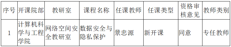 根据《关于做好2025-2026-2学期课表编排工作的通知》(校教务〔2025〕206号)要求资格审查、试讲及评委评定,我院2025-2026-2学期景忠源教师新开课符合任教资格,现予以公示!