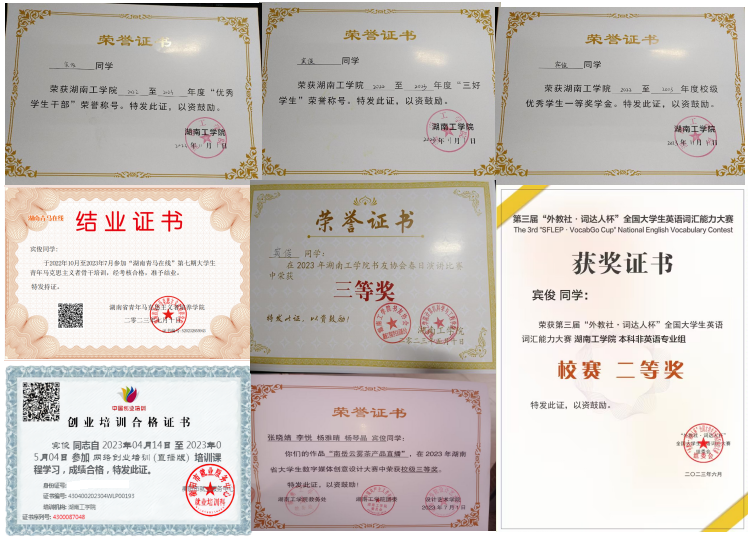 在校期间荣获国家励志奖学金1次、校级一等奖学金1次、校级优秀三好学生1次、校级优秀共青团员1次、优秀班干部1次,学习成绩排名第一,综合成绩排名专业第一。在校期间积极参加比赛活动,曾获得省级奖项荣誉1次、校级奖项荣誉6次。