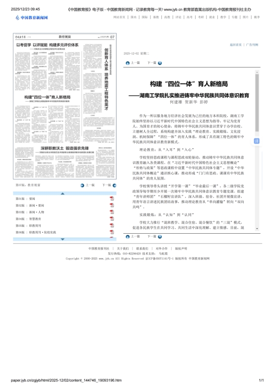 近日,《中国教育报》(2025年12月2日第07版)刊发由我校何建雄、贺新华、彭婷共同撰写的专题文章《构建“四位一体”育人新格局——湖南工学院扎实推进铸牢中华民族共同体意识教育》,深入推介了湖南工学院少数民族预科教育部的育人经验及育人成效,系统阐述了我校以习近平新时代中国特色社会主义思想为指导,将铸牢中华民族共同体意识融入办学治校与立德树人全过程,创新构建“理论教育、实践锻炼、文化浸润、机制保障”四位一体育人体系的探索与实践。文章从“理论教育:从‘入耳’到‘入心’”、“实践锻炼:从‘认知’到‘认同’”、“文化沁润:从‘符号’到‘情感’”、“机制保障:从‘试点’到‘体系’”等方面,详细介绍了学校通过课程融入、领导讲授、组建宣讲队、推行“三混”模式等一系列扎实举措,形成了具有本校特色的民族团结进步教育新模式。