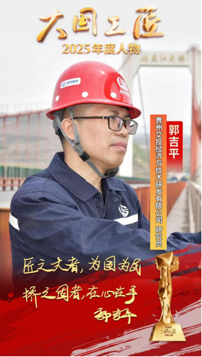 郭吉平,中共党员,2007年11月硕士毕业于中南大学桥梁与隧道工程专业,正高级工程师,全国劳动模范、“全国五一劳动奖章”获得者、2025年大国工匠年度人物、首届“国家卓越工程师团队”核心成员、贵州省政府津贴专家。现任职于贵州交投经济与技术研发有限公司,先后参与水盘高速北盘江大桥、沿河县沙坨特大桥、纳晴高速乌蒙山大桥、六安高速花江峡谷桥等大型桥梁建设,参与建设的工程项目先后荣获鲁班奖、詹天佑奖、李春奖等20余项,主持和参与省重大项目3项、省厅级课题18项,参与编制行业标准4部,获国家专利208项(其中发明专利46项),获省部级工法33项,发表SCI等核心论文20余篇。荣获交通运输部“交通运输青年科技英才”、“第十三届中国公路青年科技奖”、“第四届中国公路学会优秀科技工作者”“第三届贵州工匠”、省直属机关“学习型党员”、贵州省“第二届行业道德标兵”等荣誉。