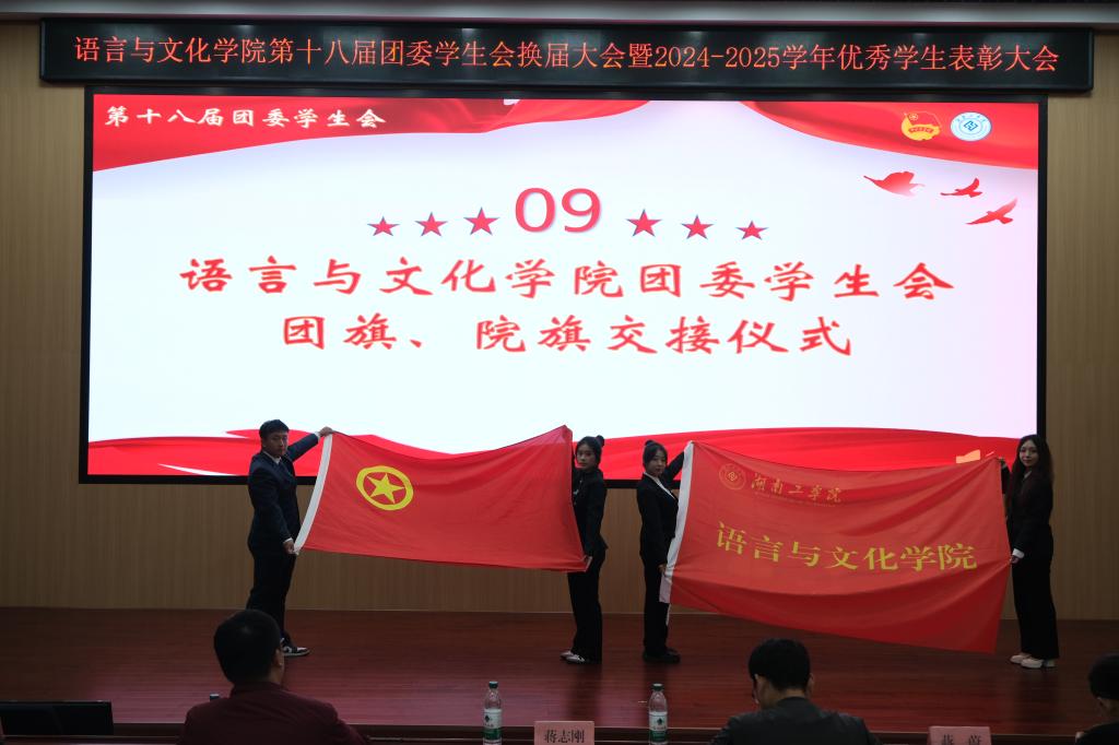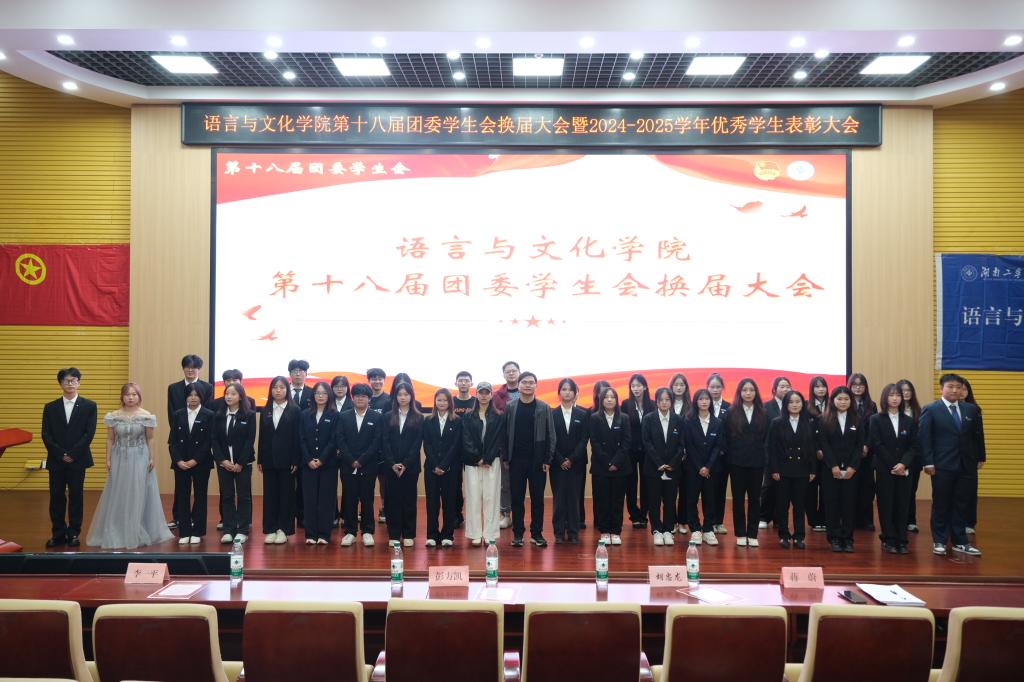 11月6日晚,语言与文化学院在明翰报告厅举行了第十八届团委学生会换届暨表彰大会。院党委书记蒋志刚、党委副书记胡忠龙、全院辅导员、团委学生会全体成员、校团委学联代表以及各兄弟学院主席团代表参加了大会。