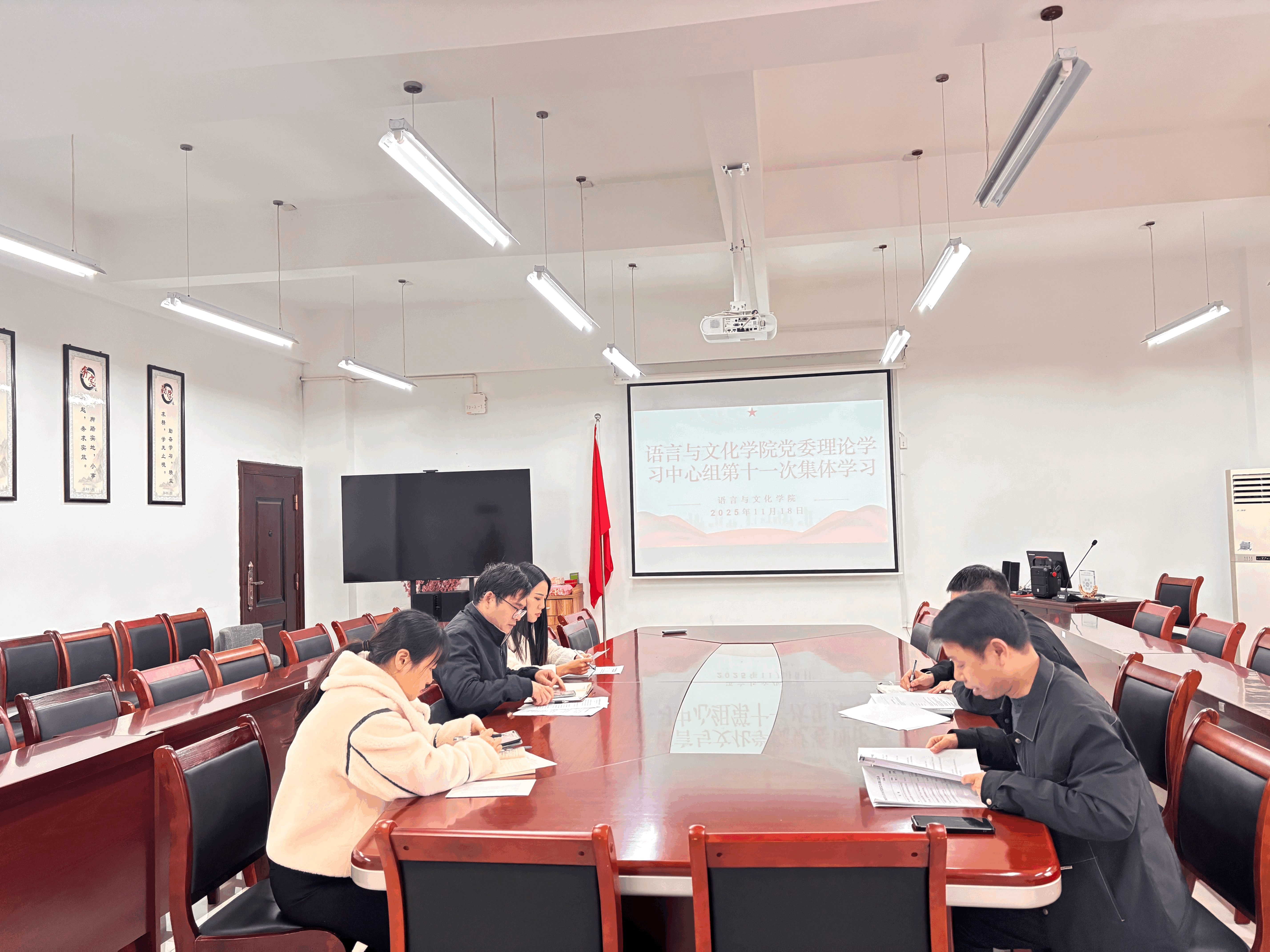 11月18日下午,学院党委理论学习中心组在外语楼317会议室举行2025年度第十一次集体学习。学院党委书记蒋志刚主持并作总结讲话,学院党委理论学习中心组全体成员参加了学习。