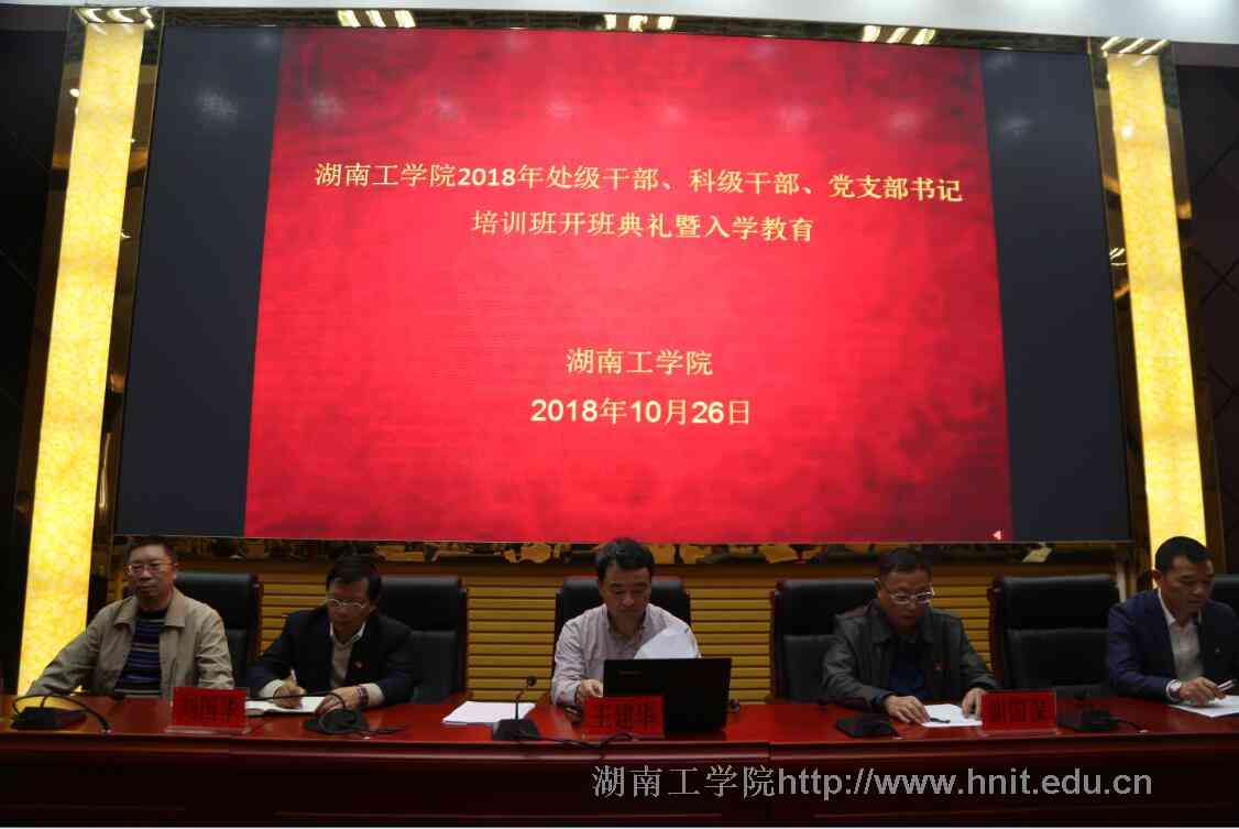 10月26日下午,湖南省高等学校第113期处级干部培训班暨湖南工学院第8期处级干部培训班开学典礼在我校500人报告厅举行。省教育厅党组成员、省委教育工委副书记、省委教育工委党校校长王建华,省高校干部培训中心主任、书记、省委教育工委党校常务副校长刘国华和我校在校校领导谢国保、曹执令、刘龙昌、罗蔚、黄红卫、袁勤出席开班典礼。开班典礼由我校副校长曹执令主持。