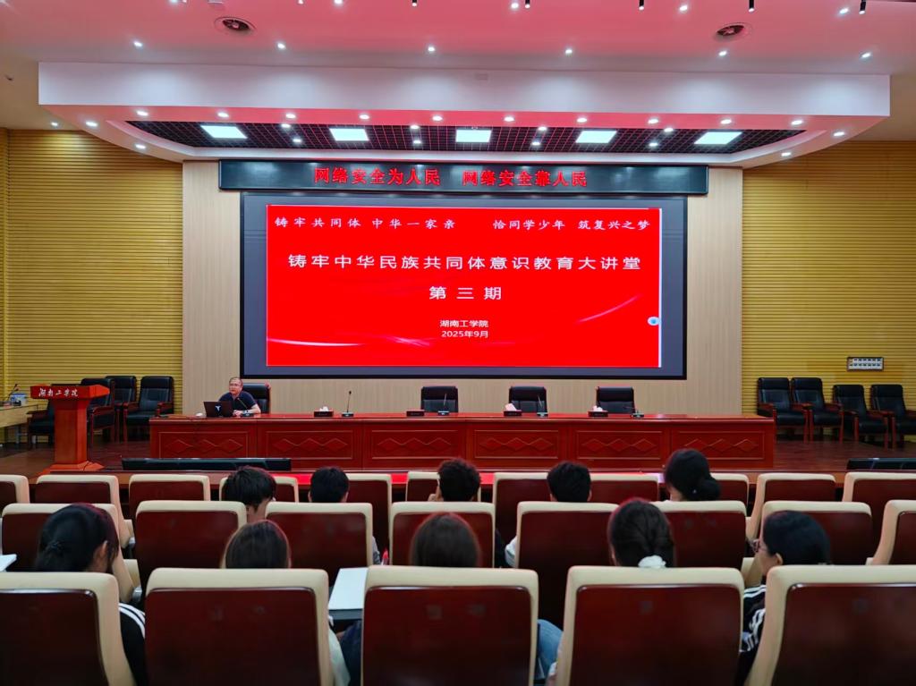 铸牢中华民族共同体意识教育大讲堂是省民宗委、省教育厅、团省委联合推出的“恰同学少年 筑复兴之梦”——2025年湖南省高校铸牢中华民族共同体意识主题体验交流系列活动之一。截止目前,我校已举办三期大讲堂,共计13场次,涵盖12个教学院3000名师生。