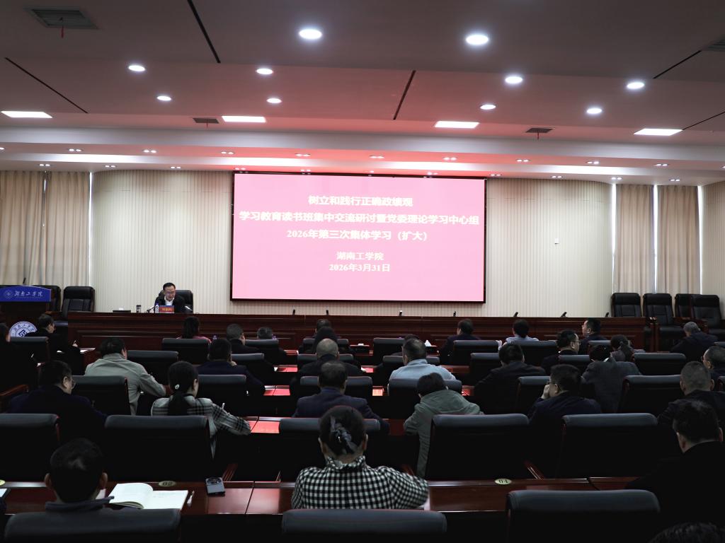 3月31日,学校树立和践行正确政绩观学习教育读书班集中交流研讨暨党委理论学习中心组2026年第三次集体学习(扩大)在船山报告厅举行。 校党委书记刘朝晖主持会议并作总结讲话。党委理论学习中心组全体成员、全校副处级以上干部、学习教育专班全体成员参加会议。