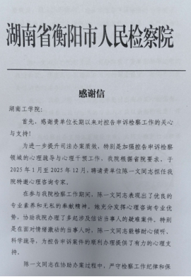 近日,衡阳市人民检察院向我校发来感谢信,对我校心理健康教育专职教师陈一文参与检察社会支持体系建设工作的优异表现予以高度肯定,对其专业能力与职业素养表示诚挚赞赏,同时对我校的人才培养与支持表示感谢。