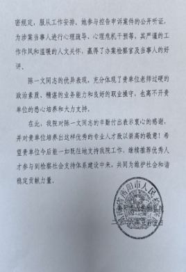 我校心理健康教育专职教师陈一文获衡阳市检察院感谢信